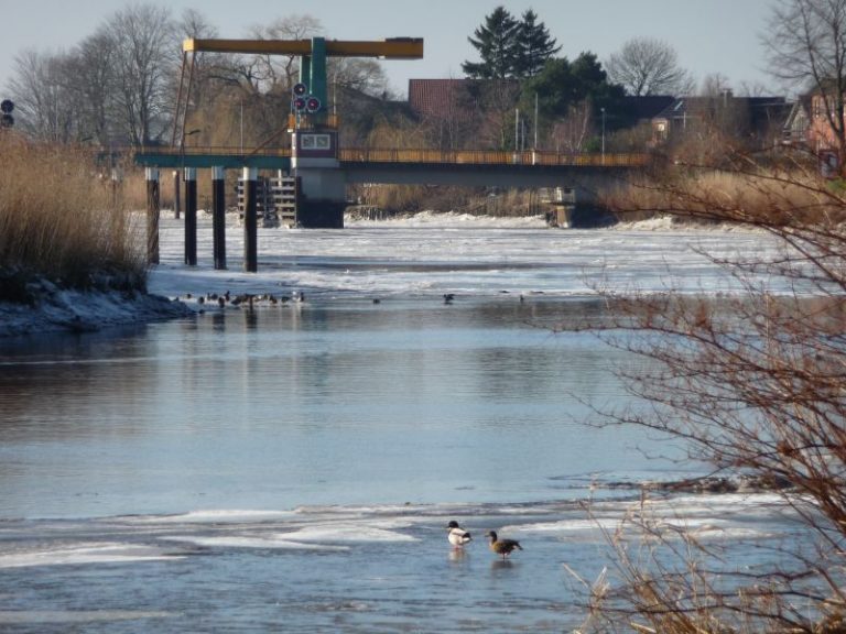 In Heiligenstedten versperrt eine Baskuleklappen-Brücke den Weg. Die Öffnung der Brücke erfolgt über den freundlichen Brückenwärter und seine Kollegen, die ihr Büro im strohgedeckten Haus an der Steuerbordseite der Stör haben.